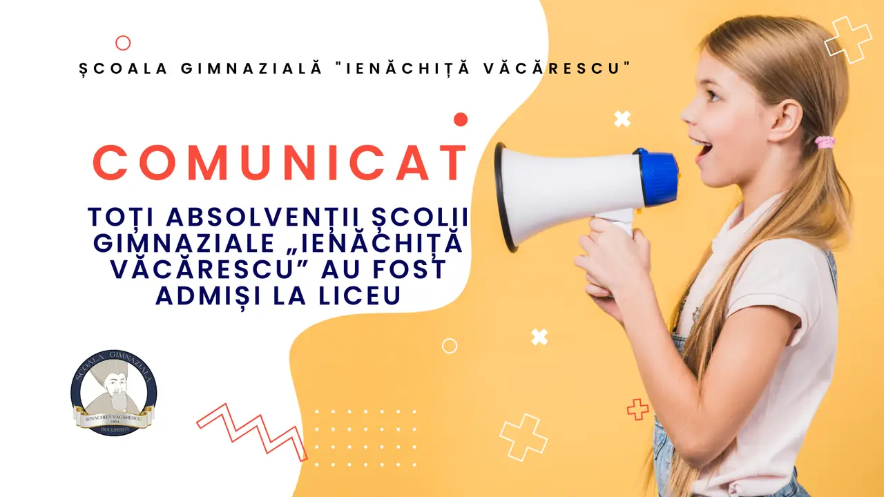 Școala Gimnazială „Ienăchiță Văcărescu” are bucuria de a anunța că toți absolvenții clasei a VIII-a au fost admiși la liceu, în urma repartizării computerizate.