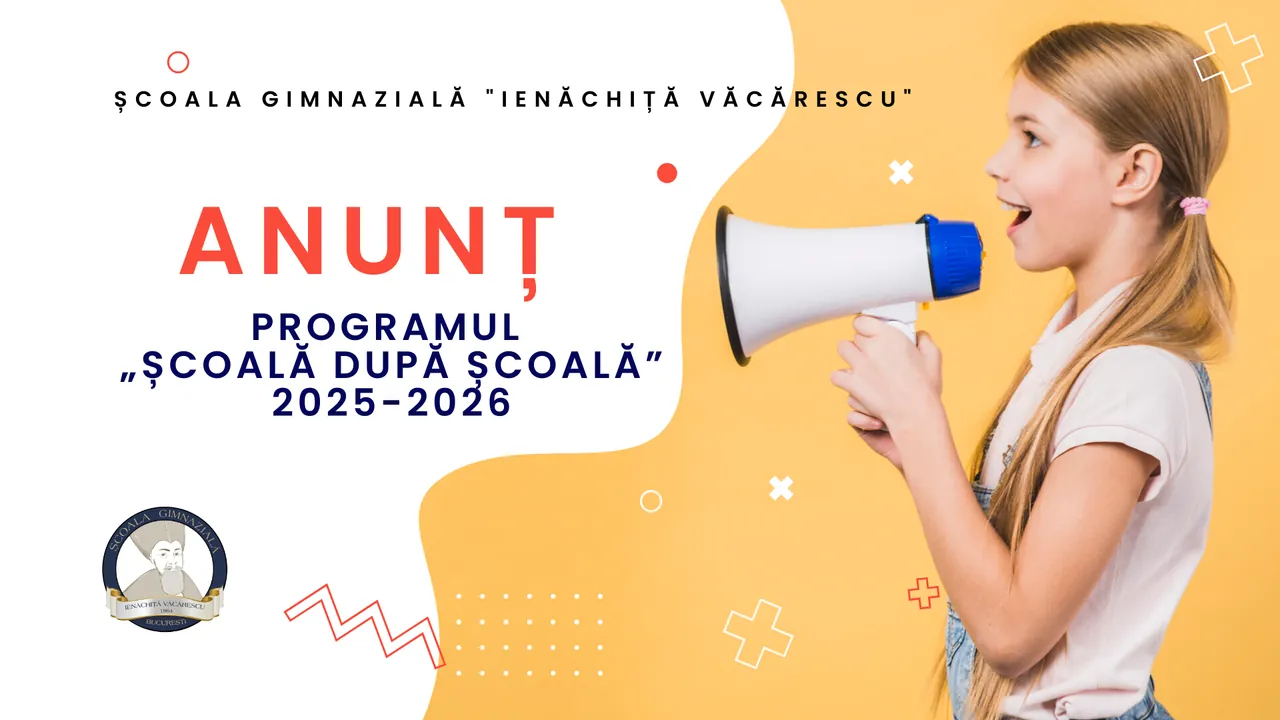 Ca urmare a Adresei ISMB Nr. 16902/56/09.07.2025, vă aducem la cunoștință că, în anul școlar 2025–2026, la nivelul Școlii Gimnaziale „Ienăchiță Văcărescu” se va organiza Programul „Școală după școală” (SDS), în conformitate cu OMECTS Nr. 5349/07.09.2011 privind organizarea activităților educative complementare.